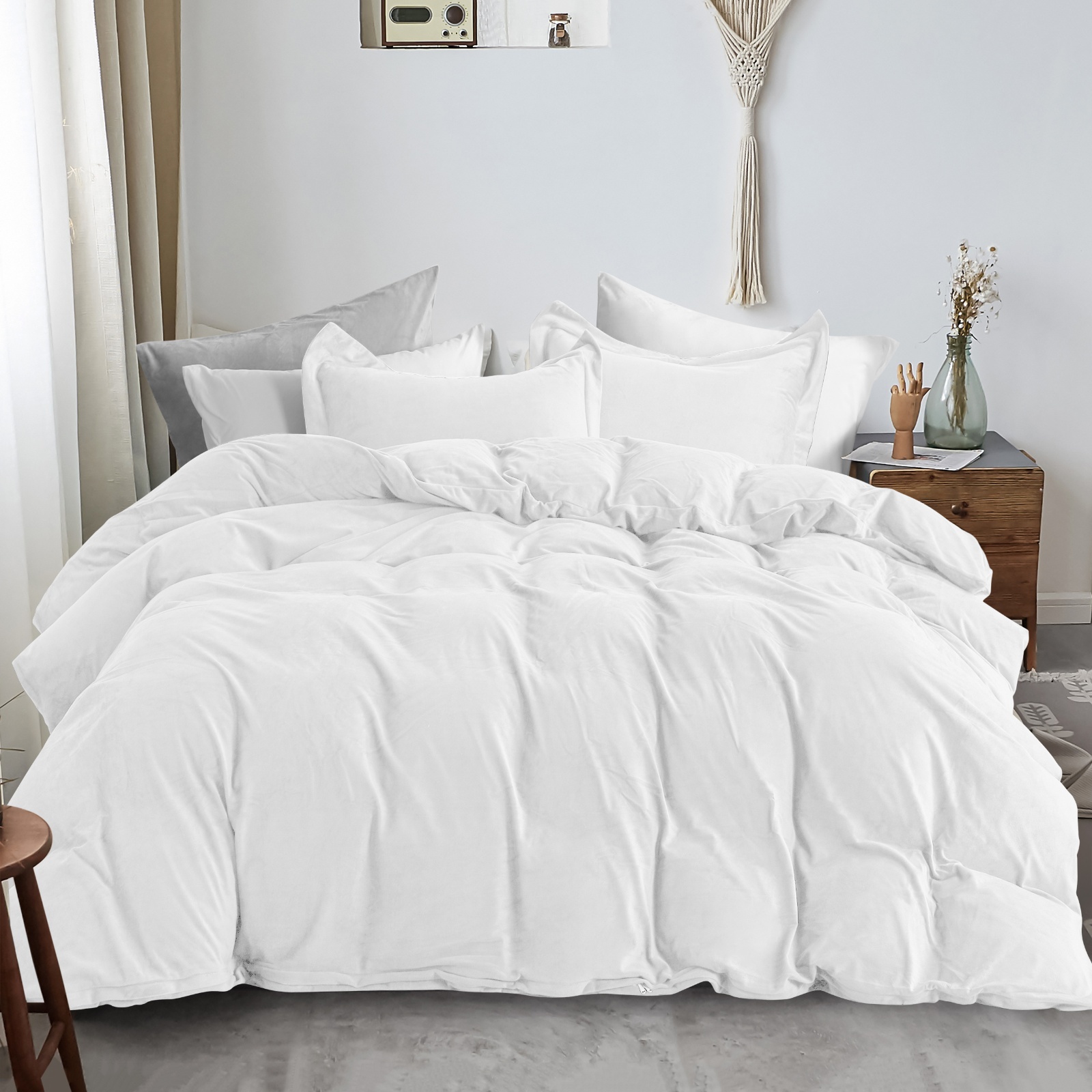 采用精致的天鹅绒面料,触感柔软顺滑,温暖舒适。耐用性强,经多次洗涤也不易起球。被套四角各有一条加固绑带,可牢牢固定被芯,有效防止被芯在被套内滑动,确保睡眠时的舒适体验。