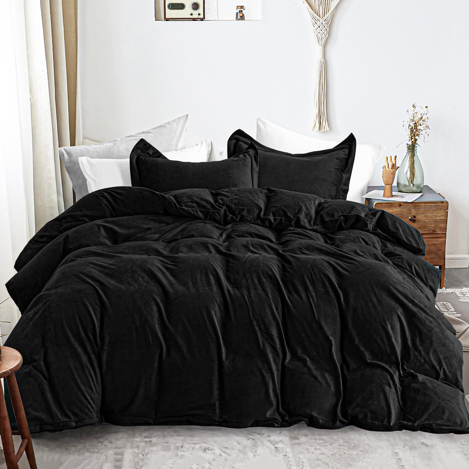 Velvet Duvet Cover Set, Luxuriously Soft, Zippered Flannel Comforter Cover, Black