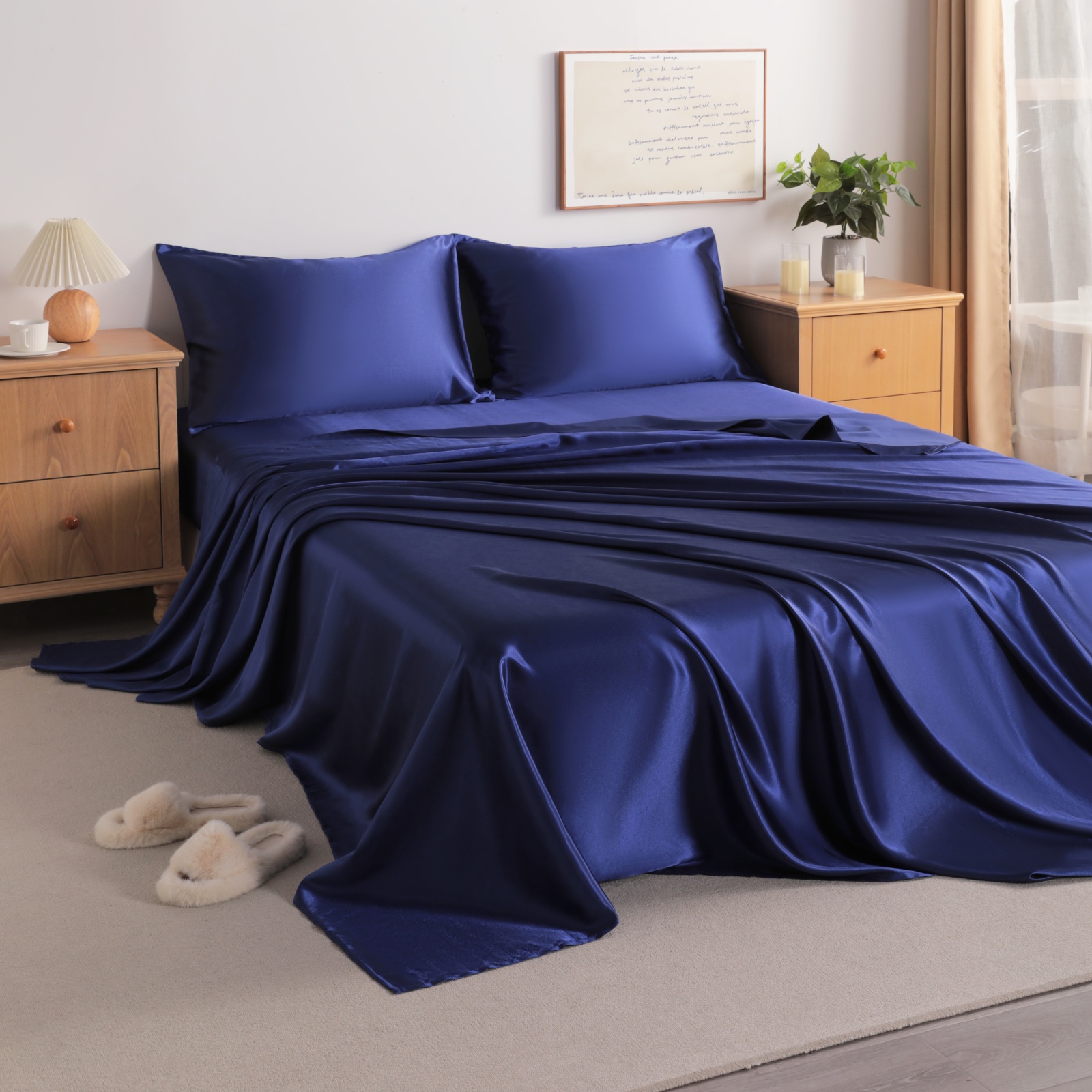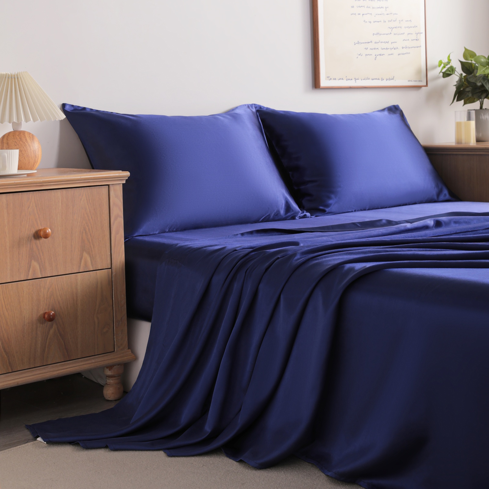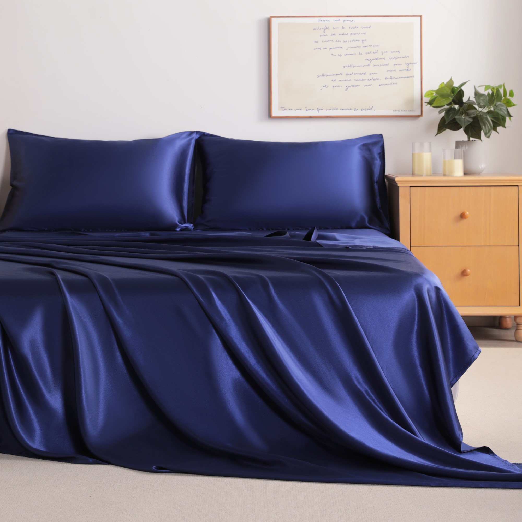 Satin Bed Sheet Set, Luxury and Silky Solid Color Sheet and Pillowcase Set, Flat Sheet, Pillowcases, Fitted Sheet with Deep Pocket, Navy Blue